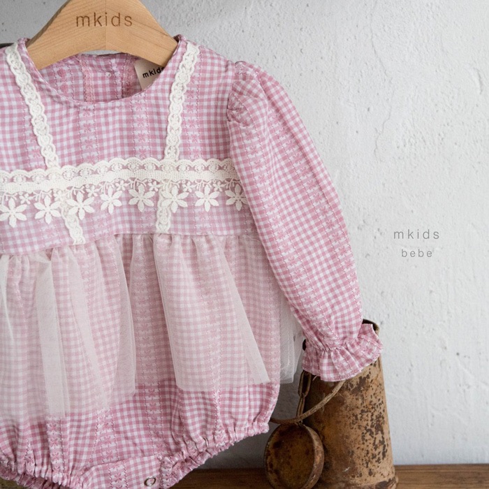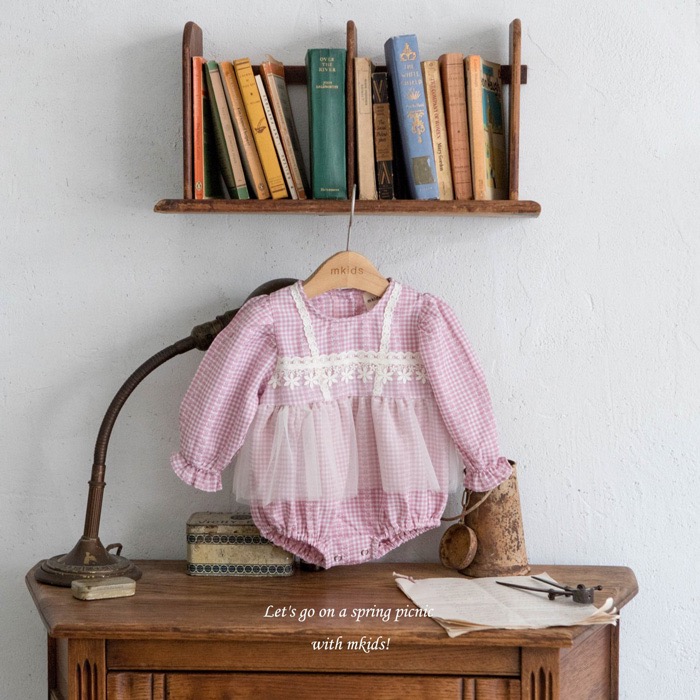 粉格紋小花蕾絲背心包屁裙